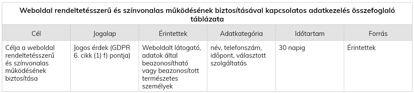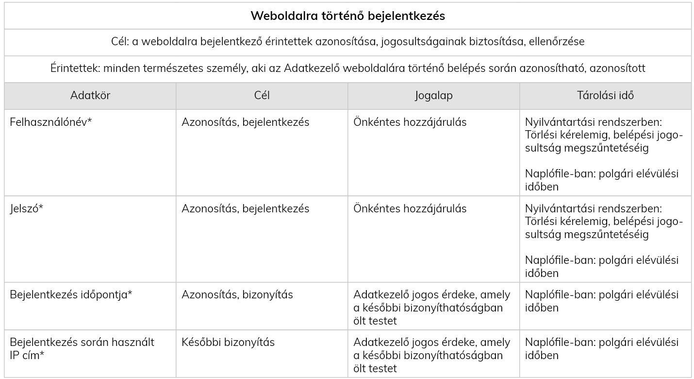 2. Kezelt adatok köre, célja, jogalapja, tárolási ideje tipikusan a következő: