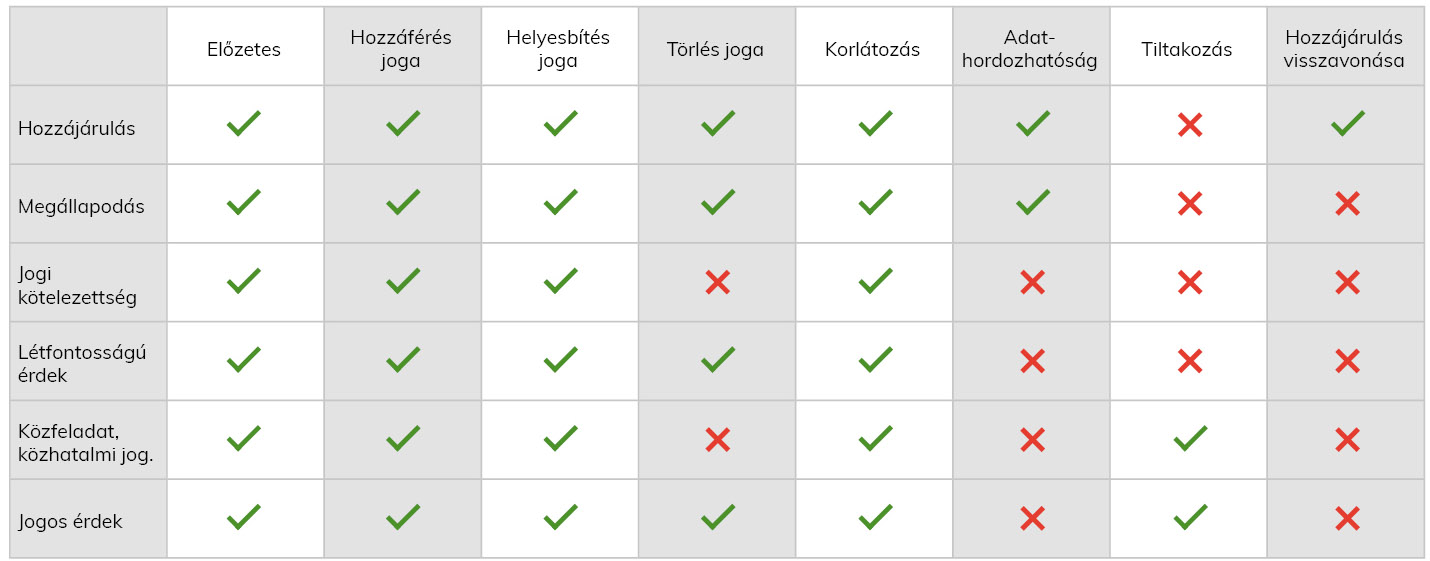 Az érintett jogai és jogalapok viszonyát a következő táblázat mutatja be, hogy az érintett számára egyértelmű legyen, hogy az alkalmazott jogalap esetén milyen jogaival élhet.