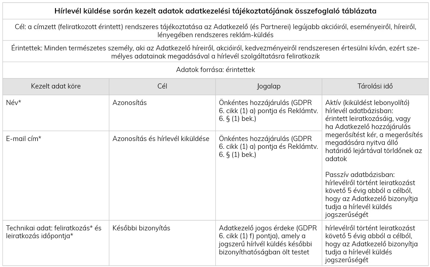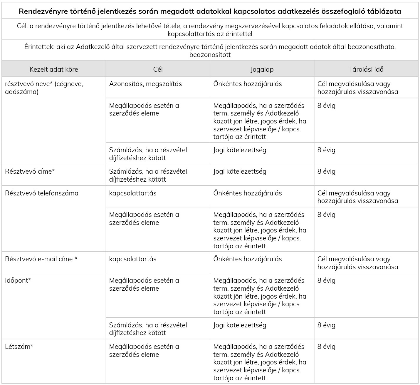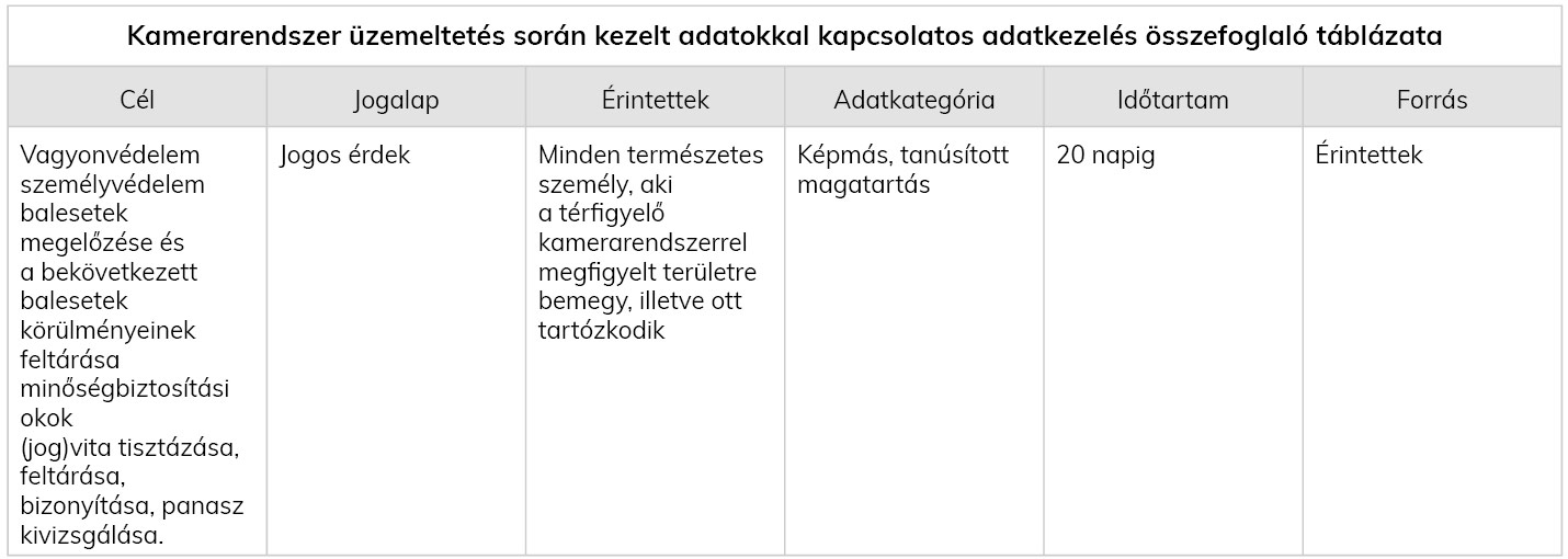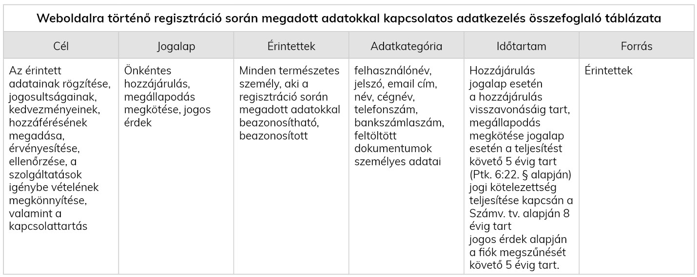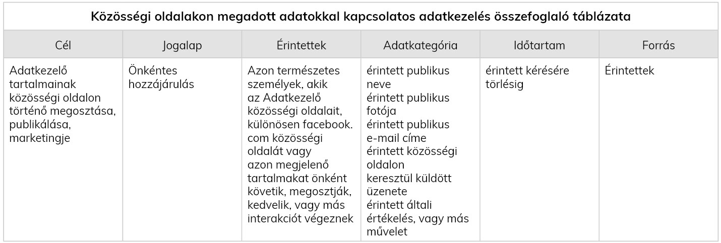 - az egyes, alább táblázatos formátumban meghatározott adatkezelések részletesebb magyarázatai az Adatkezelő székhelyén/telephelyén papír alapon is megtalálhatók, valamint kérésre az Adatkezelő elektronikusan is megküldi az érintett számára.