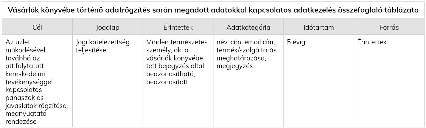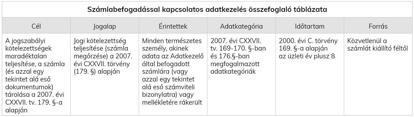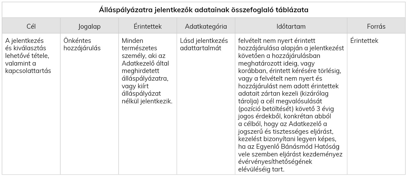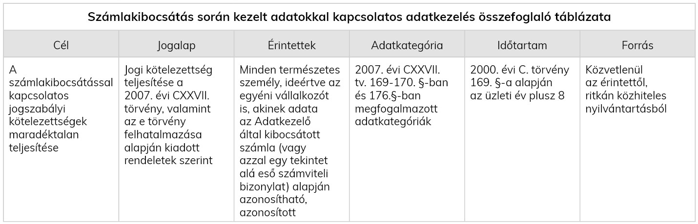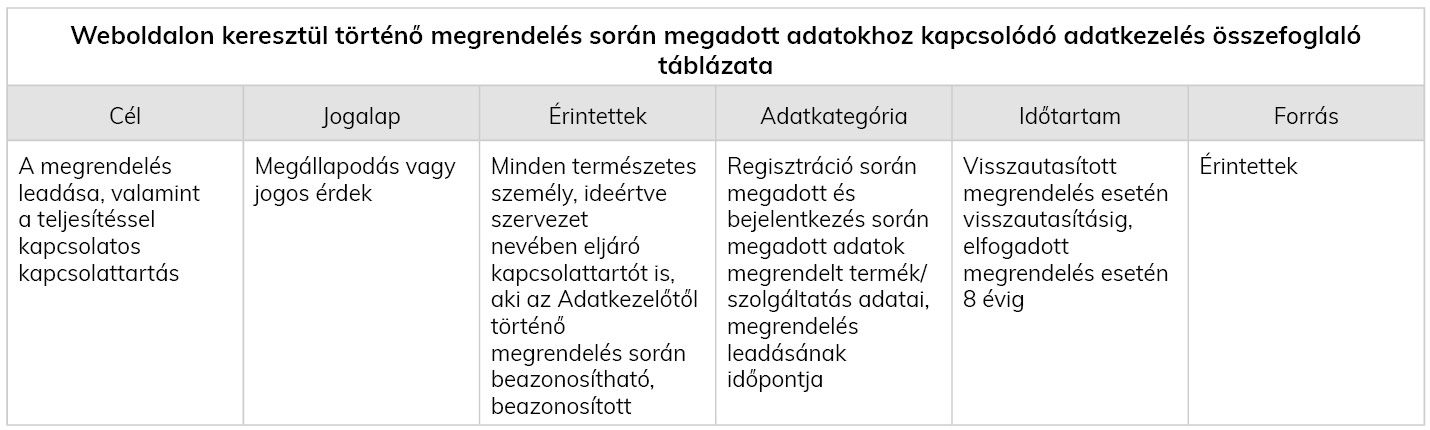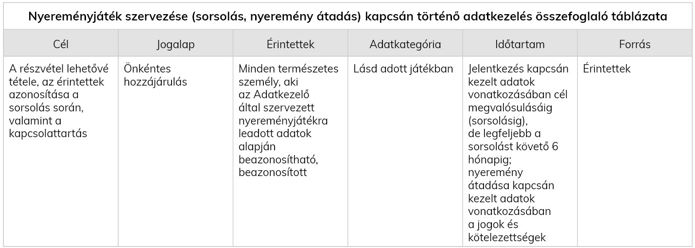 - az egyes, alább táblázatos formátumban meghatározott adatkezelések részletesebb magyarázatai az Adatkezelő székhelyén/telephelyén papír alapon is megtalálhatók, valamint kérésre az Adatkezelő elektronikusan is megküldi az érintett számára.
